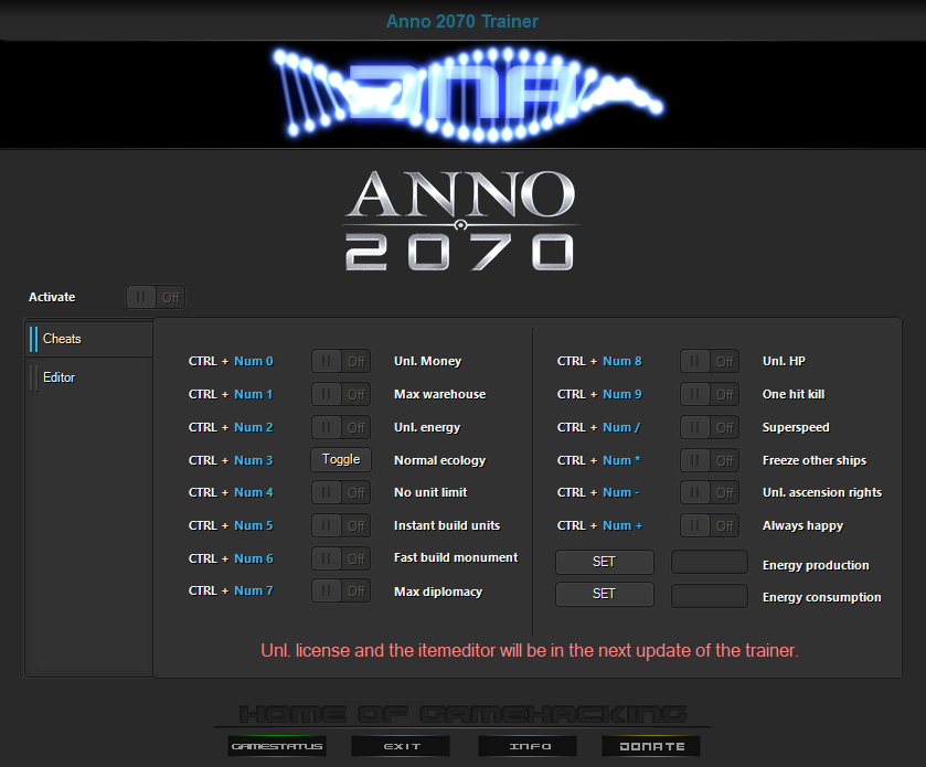 Aktuell fehlen noch der unendliche Lizenzen cheat und der item editor.
